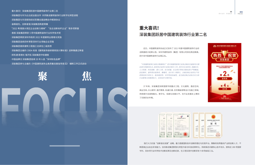 2022年是黨的二十大召開之年,是“十四五”規(guī)劃的攻堅(jiān)之年,也是深裝集團(tuán)成立36周年。這一年,在以習(xí)近平同志為核心的黨中央堅(jiān)強(qiáng)領(lǐng)導(dǎo)下,深裝集團(tuán)不折不扣把黨中央決策落到實(shí)處,堅(jiān)持“實(shí)事求是、守正創(chuàng)新、行穩(wěn)致遠(yuǎn)”的工作方針,加大改革創(chuàng)新步伐,持續(xù)優(yōu)化經(jīng)營(yíng)戰(zhàn)略,全面推動(dòng)轉(zhuǎn)型升級(jí),中標(biāo)喜訊捷報(bào)頻傳,精品工程成果豐碩,業(yè)績(jī)榮譽(yù)持續(xù)創(chuàng)造歷史新高,實(shí)現(xiàn)經(jīng)濟(jì)效益與社會(huì)效益共生發(fā)展,為百年深裝的宏偉圖景寫下濃墨重彩的一筆。