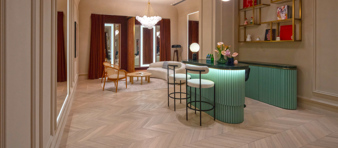 為打造靈活商業(yè)空間,項(xiàng)目管理團(tuán)隊(duì)結(jié)合場(chǎng)地劃分,通過(guò)大面積實(shí)木地板、仿古地磚、水磨石、大理石的鋪貼,以達(dá)到整體還原度高、平整度高、簡(jiǎn)潔大氣、通縫順直的效果,通過(guò)梳理工藝做法、基層做法、面層收口方式等科學(xué)的質(zhì)量管控來(lái)還原設(shè)計(jì)效果,讓人沉浸式感受松弛而自渡、精致而優(yōu)雅的法式生活。