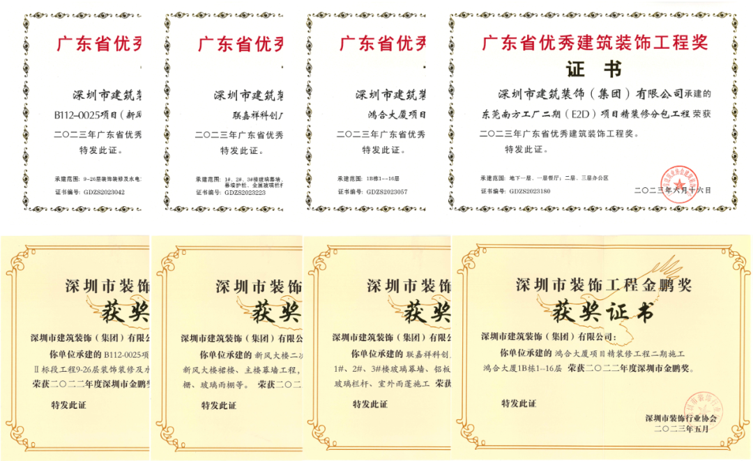 近期,深圳市建筑裝飾(集團)有限公司憑借先進綠色建造理念、堅實研發(fā)創(chuàng)新支撐、嚴格工程質(zhì)量管控,承建的東莞南方工廠二期(E2D)、鴻合大廈項目精裝工程二期、聯(lián)嘉祥科創(chuàng)廠區(qū)項目門窗幕墻工程、新風大樓(新風和睦家醫(yī)院)精裝工程Ⅱ標段、新風大樓(新風和睦家醫(yī)院)幕墻工程榮獲4項“廣東省優(yōu)秀建筑裝飾工程獎”及4項“深圳市裝飾工程金鵬獎”,再獲行業(yè)高度認可。