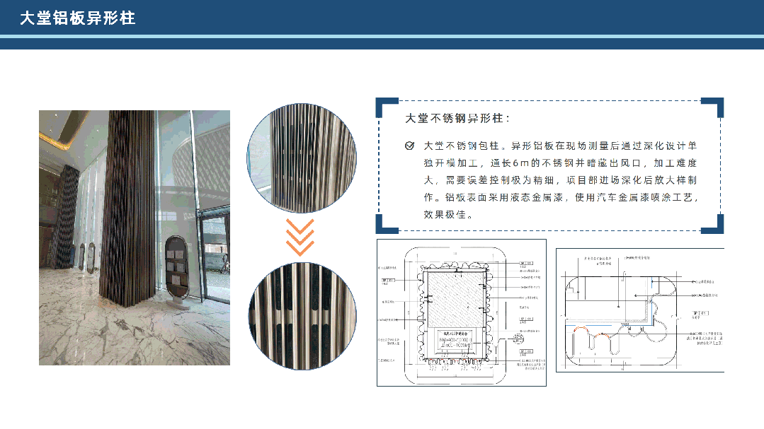 集團始終秉持品質履約、創(chuàng)先爭優(yōu)的理念,自主研發(fā)“一種泳池池壁結構”“一種安全型泳池池壁系統(tǒng)”等國家實用新型專利,反復推敲施工節(jié)點及工藝工法,其中“大堂不銹鋼異形柱”“公共走道異型石材鋪貼”“木飾面順紋拼裝”工藝等均實現標準化、模塊化、精細化的裝飾施工,減小施工誤差,增強成品穩(wěn)定性,將匠心品質融入建設的每一處細節(jié),最大程度呈現設計效果,向客戶交出完美答卷。