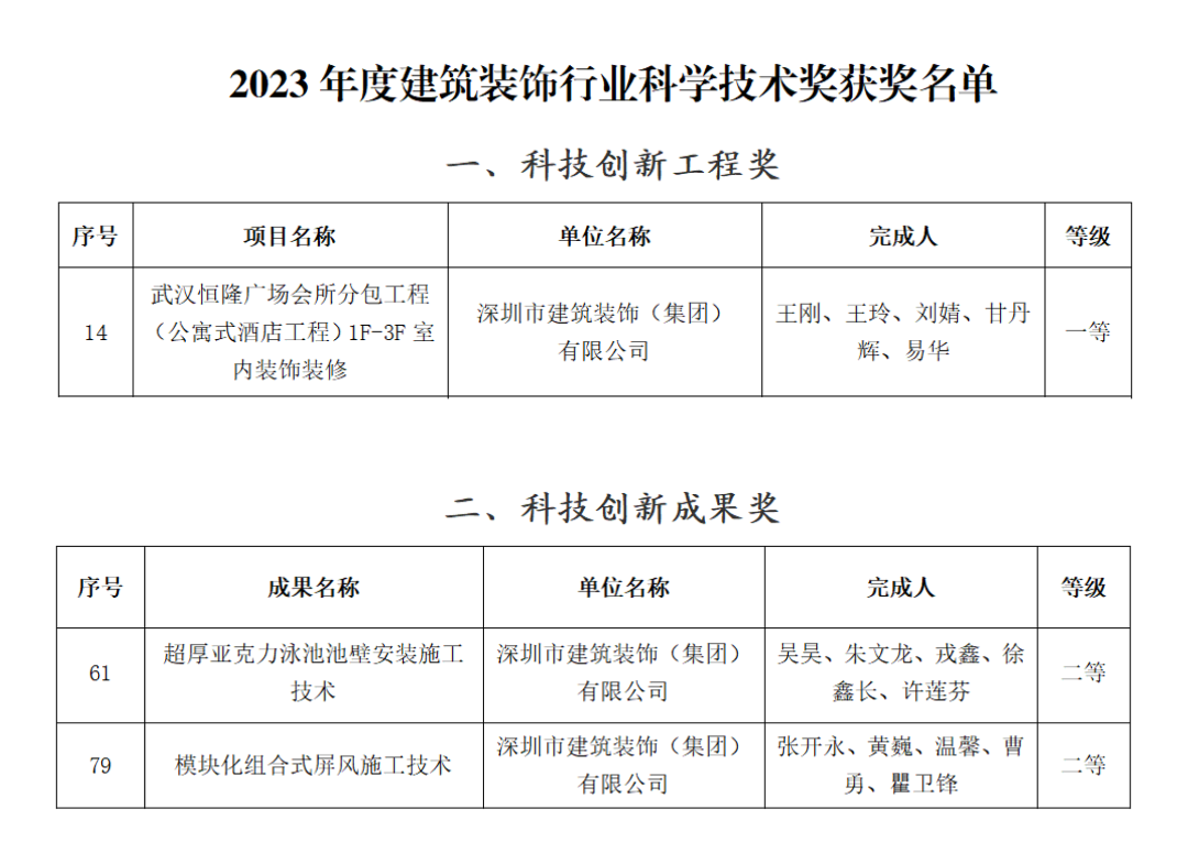 近日,2023年度中國建筑裝飾行業(yè)科學技術獎獲獎名單正式公布。深圳市建筑裝飾(集團)有限公司武漢恒隆廣場會所室內裝飾工程榮獲科技創(chuàng)新工程獎一等獎,“超厚亞克力泳池池壁安裝施工技術”“模塊化組合式屏風施工技術”均榮獲科技創(chuàng)新成果獎二等獎,標志深裝集團主要技術和經濟指標達到國內領先水平,彰顯科技創(chuàng)新硬實力。