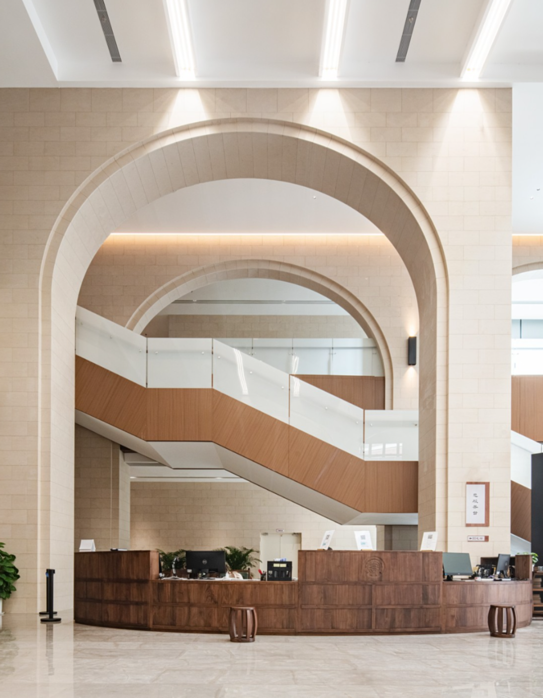 大堂拱形石門(mén)造型由大量小板塊石材拼接而成,對(duì)精準(zhǔn)度要求極高,為確保材料弧度圓順且排版一致,集團(tuán)采用鋼架弧形定制,每一條角鋼都精準(zhǔn)定位,精準(zhǔn)測(cè)量每一條軸線(xiàn)再下單,做到收邊收口無(wú)誤差、無(wú)拆改,六面防護(hù)無(wú)損壞,嚴(yán)格把控施工材料加工的精度;由于11米挑高設(shè)計(jì),高空吊裝面板難度較大,集團(tuán)特此研討專(zhuān)項(xiàng)安裝方案,切實(shí)解決安裝難題與品質(zhì)管控。