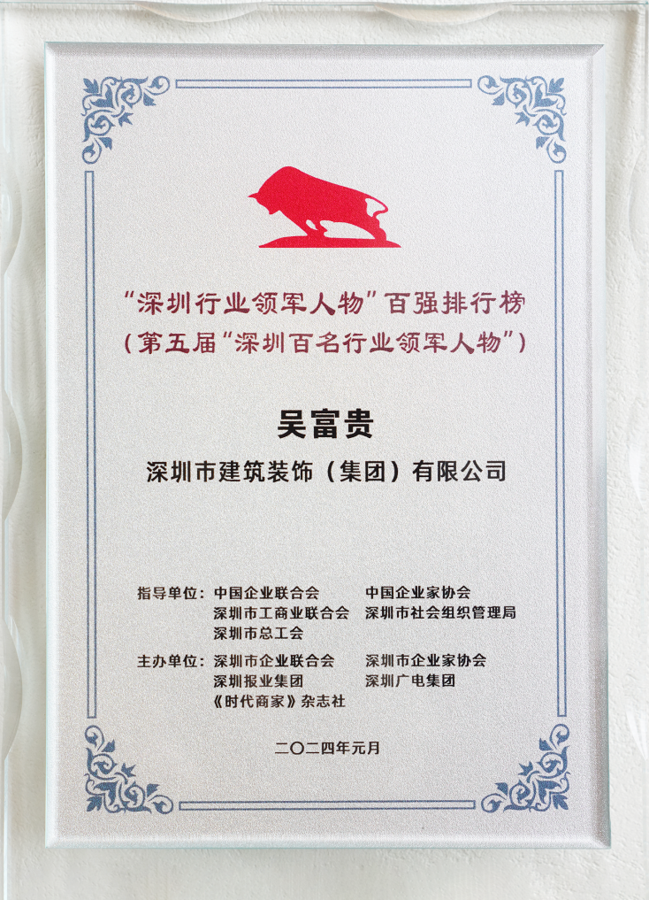 多年來,吳富貴董事長矢志不渝在創(chuàng)新與奮斗的道路上砥礪前行,以實際行動踐行領(lǐng)軍企業(yè)家的責(zé)任與擔(dān)當(dāng),堅守引領(lǐng)行業(yè)革新、強(qiáng)化行業(yè)協(xié)作、振興民族產(chǎn)業(yè)、促進(jìn)社會進(jìn)步的崇高使命。他以前瞻性戰(zhàn)略眼光和創(chuàng)新思維引領(lǐng)深裝集團(tuán)緊跟時代步伐,推行以創(chuàng)新驅(qū)動為核心,積極推動企業(yè)組織架構(gòu)優(yōu)化、風(fēng)險防控機(jī)制健全、數(shù)字轉(zhuǎn)型升級等深層次變革,高度重視人才梯隊建設(shè)與激勵機(jī)制創(chuàng)新,深度融合市場趨勢與客戶需求,構(gòu)建具有前瞻性和競爭力的經(jīng)營戰(zhàn)略,為企業(yè)及行業(yè)的持續(xù)高發(fā)展注入強(qiáng)大動力,并先后榮膺“中國建筑裝飾行業(yè)突出貢獻(xiàn)企業(yè)家”“深圳百名創(chuàng)新奮斗者”“獻(xiàn)禮特區(qū)40年,致敬品牌40人”品牌人物、“企業(yè)黨建實踐創(chuàng)新先進(jìn)個人”“2023粵港澳大灣區(qū)企業(yè)創(chuàng)新力榜單——創(chuàng)新杰出人物榜”等多項殊榮,贏得了社會各界的廣泛贊譽(yù)與高度認(rèn)可,為全國建筑裝飾行業(yè)樹立了典型標(biāo)桿。