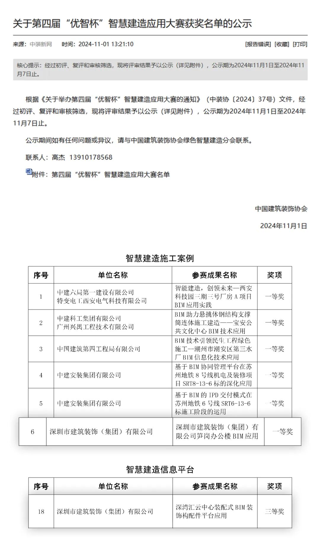 近日, 第四屆“優(yōu)智杯”智能建造應(yīng)用大賽獲獎(jiǎng)名單公布,深圳市建筑裝飾(集團(tuán))有限公司《深裝集團(tuán)筍崗辦公樓 BIM應(yīng)用》項(xiàng)目榮獲智慧建造施工案例一等獎(jiǎng),《深灣匯云中心裝配式BIM裝飾構(gòu)配件平臺(tái)應(yīng)用》項(xiàng)目榮獲智慧建造信息平臺(tái)三等獎(jiǎng)。