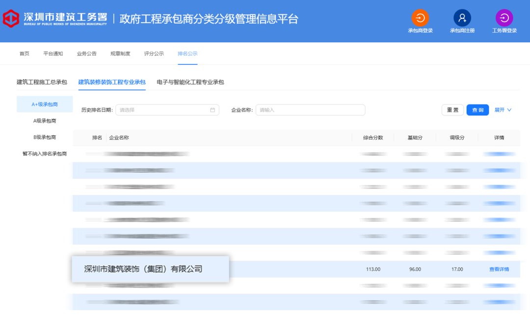 近日,深圳市建筑工務(wù)署建筑公布政府工程承包商分類分級排名,深圳市建筑裝飾(集團(tuán))有限公司憑借卓越工程質(zhì)量、高效項目管理、持續(xù)技術(shù)創(chuàng)新、杰出履約水平等綜合實力,榮登建筑裝修裝飾工程專業(yè)A+級承包商,市場競爭力持續(xù)攀升。