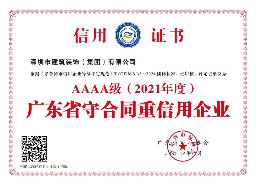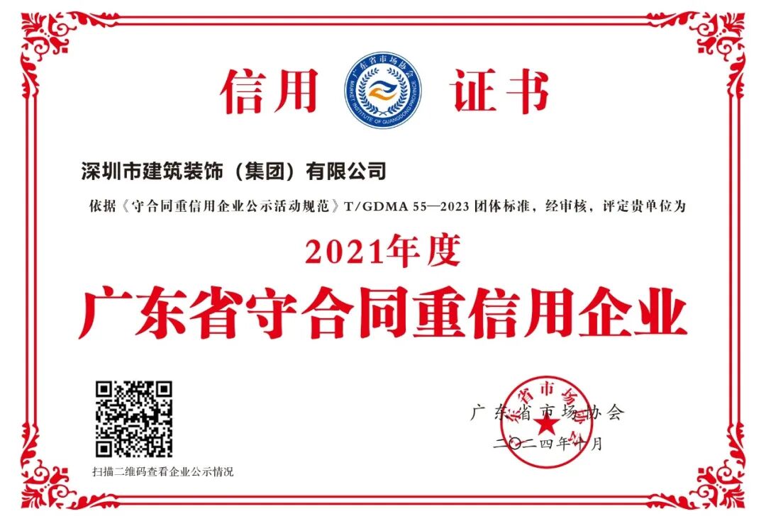 近期,廣東省市場(chǎng)協(xié)會(huì)正式發(fā)布2021年度“守合同重信用企業(yè)”公示名單,深圳市建筑裝飾(集團(tuán))有限公司憑借長(zhǎng)期杰出社會(huì)履責(zé)、信用建設(shè)與品質(zhì)履約再度蟬聯(lián)榮譽(yù),第27年獲評(píng)“廣東省守合同重信用企業(yè)”稱(chēng)號(hào)。