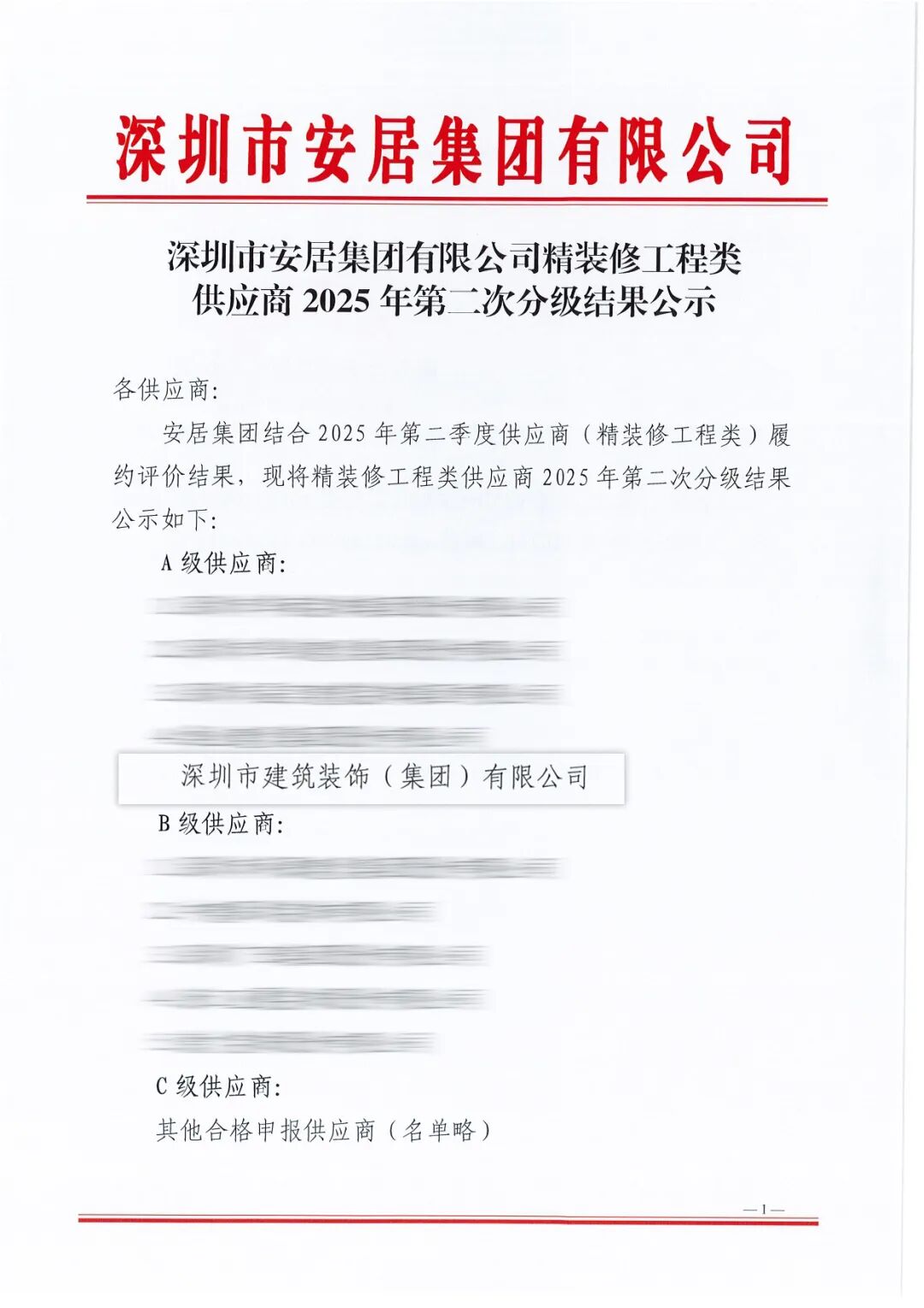 近日,深圳市安居集團(tuán)有限公司(以下簡稱“深安居”)發(fā)布2025年第二次供應(yīng)商分級評定結(jié)果,深圳市建筑裝飾(集團(tuán))有限公司憑借扎實(shí)的綜合實(shí)力與杰出的項目履約表現(xiàn),再次獲評精裝修工程類A級承包商。此次評級圍繞企業(yè)資信、同行誠信評價、經(jīng)營狀況及履約能力等維度展開綜合評估,體現(xiàn)了市場對深裝集團(tuán)綜合能力的高度認(rèn)可,也展現(xiàn)了對集團(tuán)深耕精裝修領(lǐng)域、積極服務(wù)民生工程建設(shè)成績的肯定。